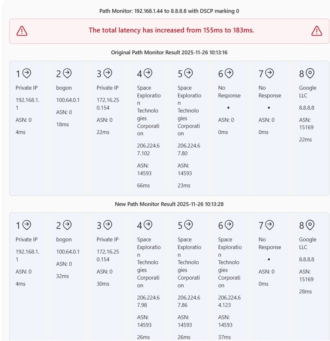 The raw JSON however is still multi-dimensional and can be difficult to digest into a traditional monitoring platform so we’ve added a notification method. Pathlens can calculate a baseline for each path and send a Microsoft Teams notification should a hop-count or latency threshold be breached.